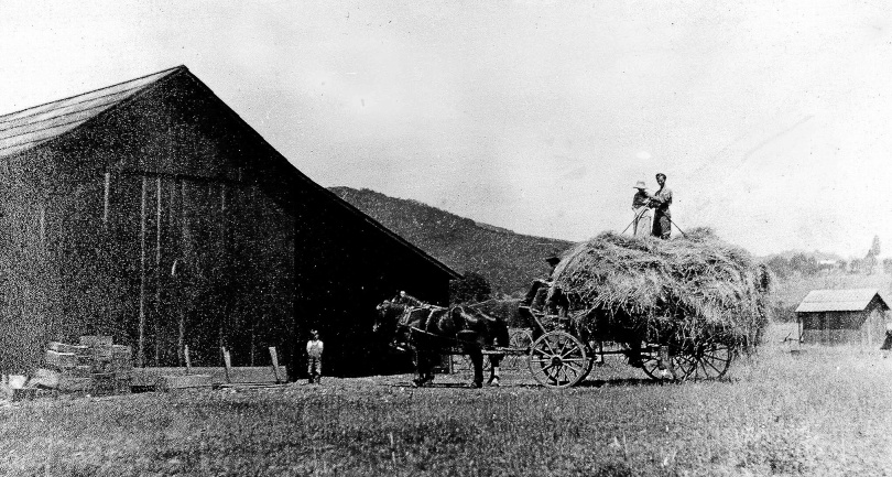 I painted the haying scene and homestead from these photos of the Hunt ranch in Coyote Valley, one of many long-established farms in the area. It is appropriate and bittersweet to memorialize it in the mural since the ranch is now under the waters of Lake Mendocino, after construction of the 1958 Coyote Valley Dam.